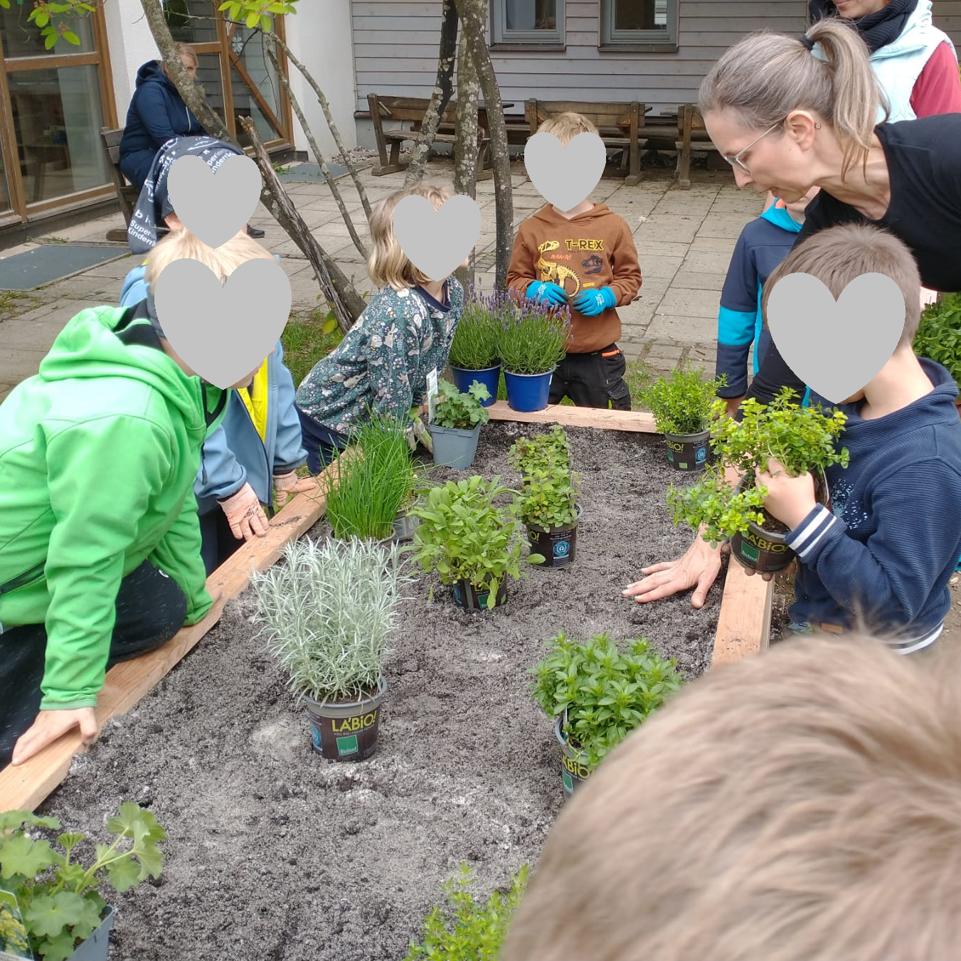Nach dem erfolgreichen Bienenprojekt der Vorschulkinder im letzten Jahr, wurde eine feste Blumen AG gegründet. Frau Jensen hat hier wieder ehrenamtlich die Leitung übernommen. Vielen Dank dafür. In der AG können interessierte Kinder freiwillig mitmachen. So wird das Wissen aus dem letzten Jahr weitergegeben und die Blühfläche weitergepflegt. Außerdem haben die Kinder, gemeinsam mit einem Elternteil, ein Hochbeet im Garten errichtet. Hier wurden Kräuter eingepflanzt, die die Kinder zur Brotzeit dann auch probieren dürfen. Der Förderverein hat das Material für das Hochbeet finanziert.
